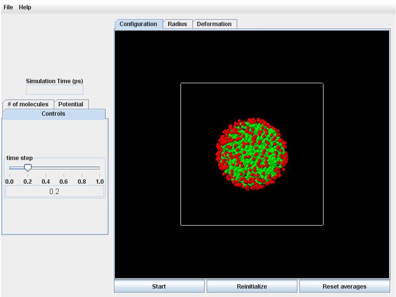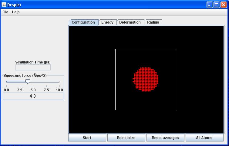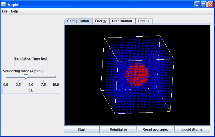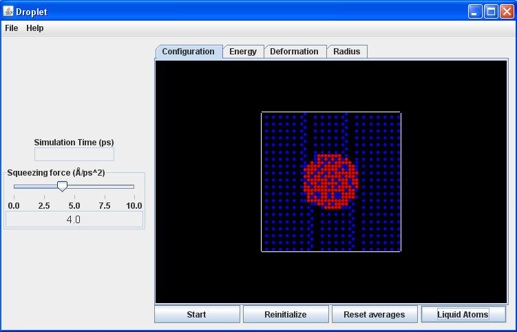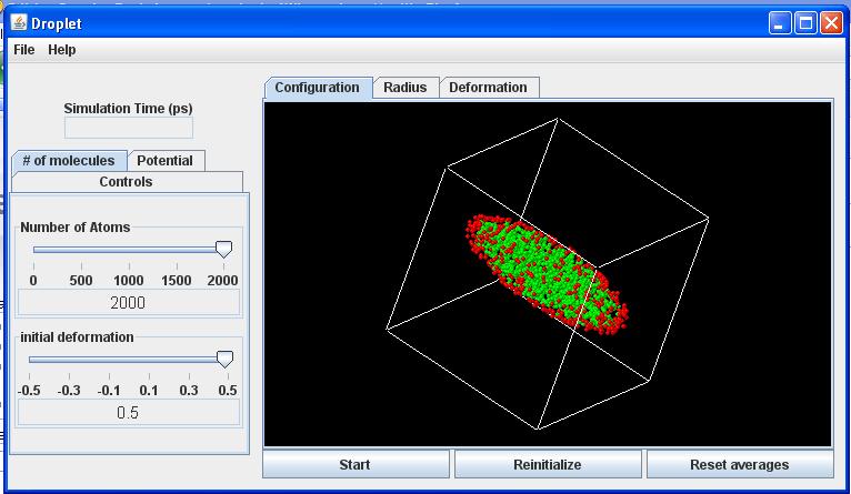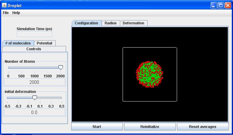 Reinitialize button: Creates a new random placement of particles, according to the overall parameters (number of particles, deformation) specified with the Controls.