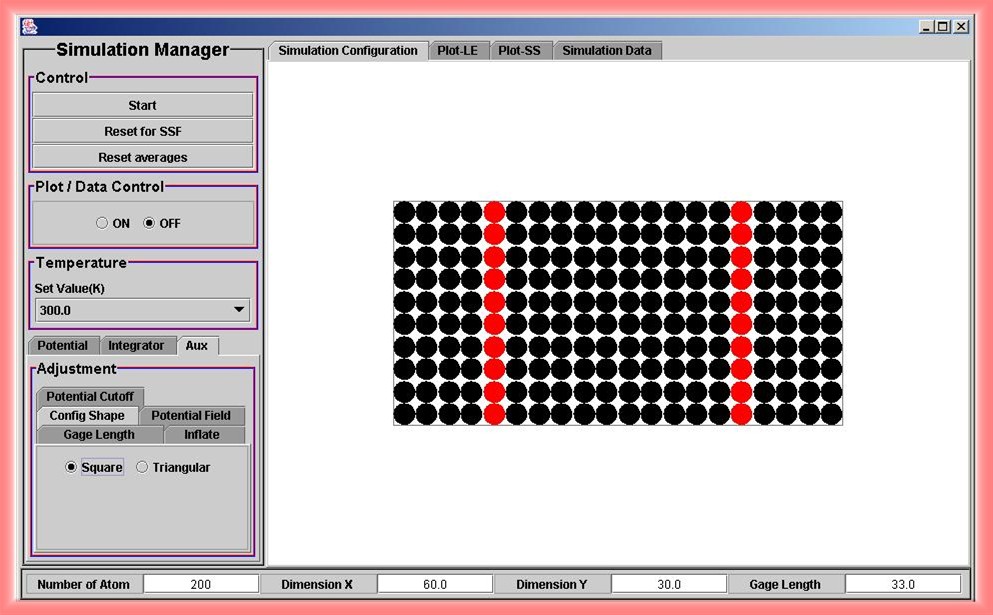 Reset the simulation to have the same initial conditions as in the previous example by pressing the Reset for SSF and Reset Averages buttons. Under the AUX tab, select Config Shape, turn on the option for a square lattice, and run the simulation.